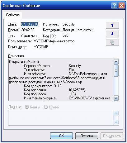 Выбираем пункт «Политика аудита», смотрим что доступно. «Аудит доступа к объектам» - это то, что нам нужно, двойной щелчок по надписи, открывается меню, в нем выбираем то, что должно фиксироваться (успех/отказ или вместе). Так же можем познакомиться с описанием данной функции аудита. Когда проделаны эти операции, то проблем при включении аудита в свойствах объекта не возникнет. Кстати, специалисты рекомендуют познакомиться поближе со всеми параметрами безопасности. Здесь могут найтись необходимые опции системы, как для простого пользователя, так и для администратора. Особое внимание можно уделить назначениям прав пользователя, и параметрам безопасности. Но, вернёмся к аудиту. Мы же выбрали папку, для которой система будет вести журнал успешных обращений. А где же этот журнал?