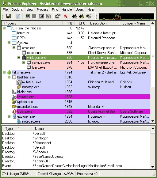 Итак, список «разрешённых», системных процессов и процессов. Иногда процессы запущенных вирусов генерируют название процесса, совпадающее с системным. Отличить их можно по аномально большому выделению памяти и возможности завершения. Такие процессы помечены восклицательным знаком.